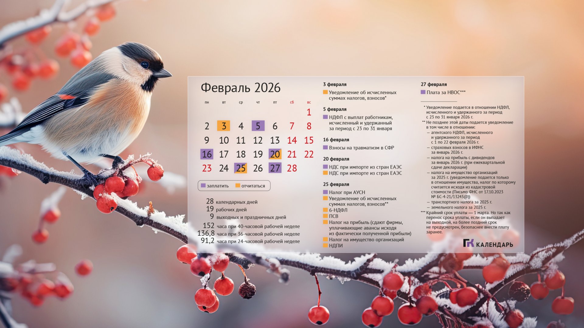 Обои на рабочий стол Бухгалтерский календарь февраль 2025 г.